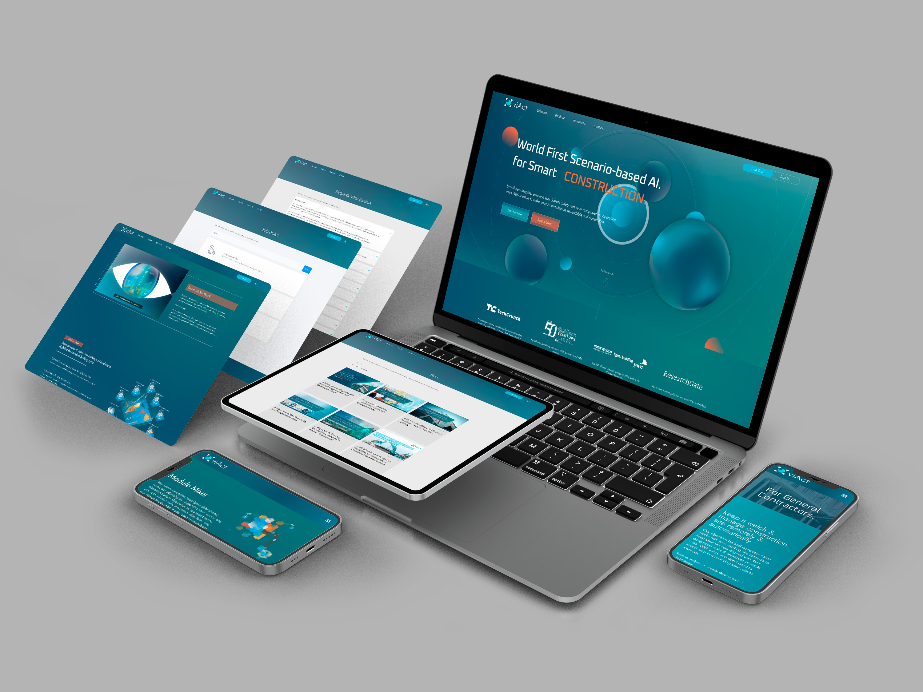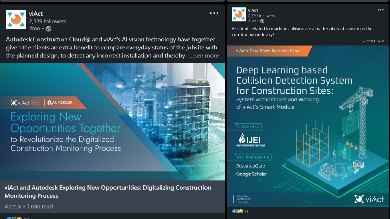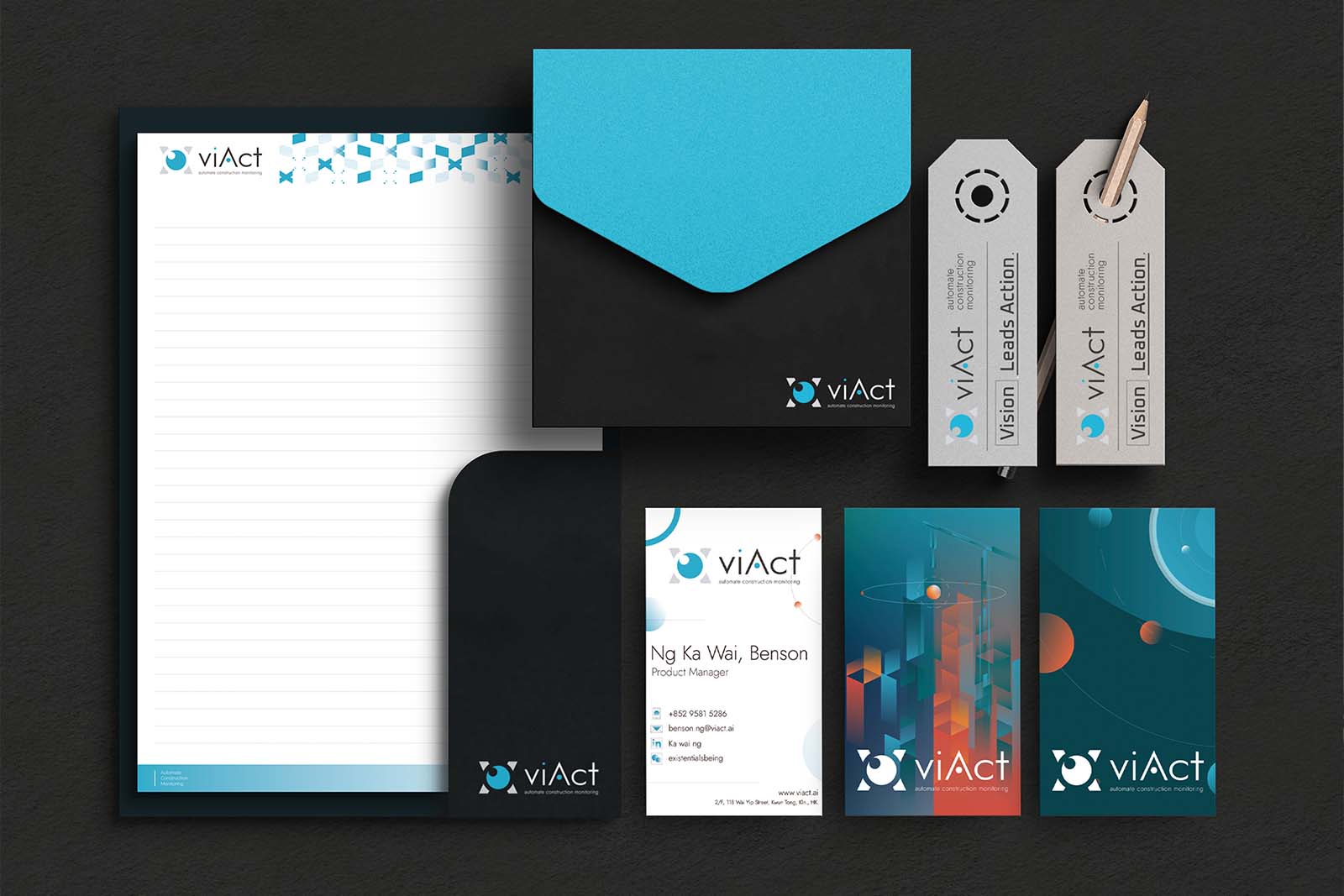 As a startup investigating intelligent architectural detection systems, ViAct looks forward to challenging the status quo and bringing dynamic technological innovation to the traditional architecture industry. Differentiating from the traditional image of the architecture industry, the use of cyan tone is anticipated to establish a distinct brand identity and set the company apart from the competition.